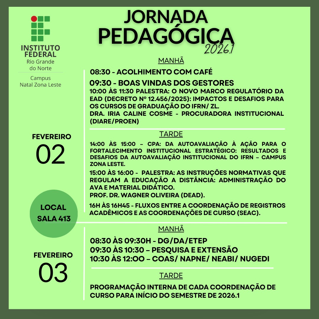 IFRN Zona Leste realiza Jornada Pedagógica 2026.1 nos dias 2 e 3 de fevereiro
