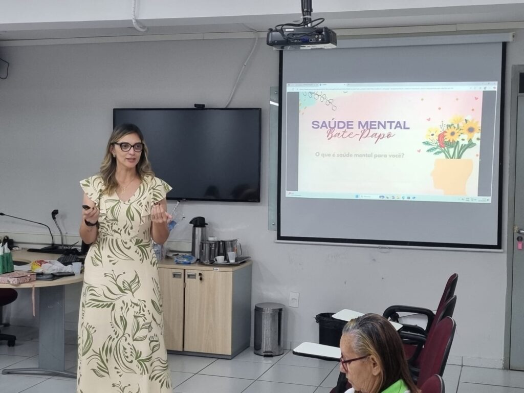 Ao longo da atividade, foram discutidos temas centrais para a saúde mental, como autoconceito, autoimagem e autocuidado integral, abrangendo as dimensões física, emocional, social e espiritual. Clarissa ressaltou a importância da consciência corporal e emocional como ferramentas para reconhecer sinais de desgaste e promover equilíbrio.