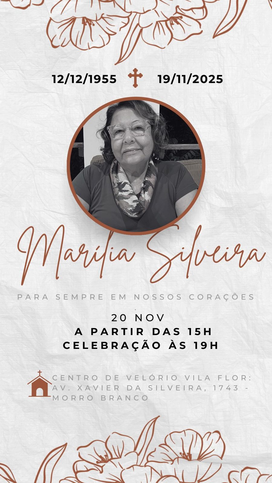 O velório será realizado nesta quinta-feira, 20 de novembro, no Centro de Velório Vila Flor (Av. Xavier da Silveira, 1743 – Morro Branco), a partir das 15h. Já a missa será as 19 horas na mesma data.