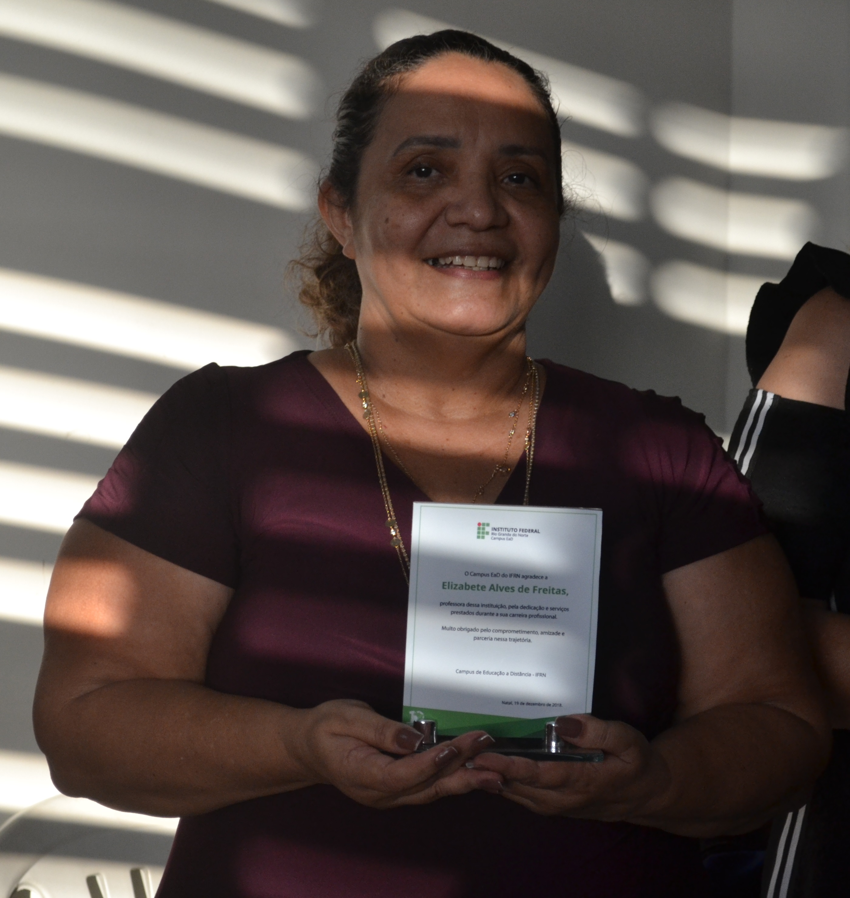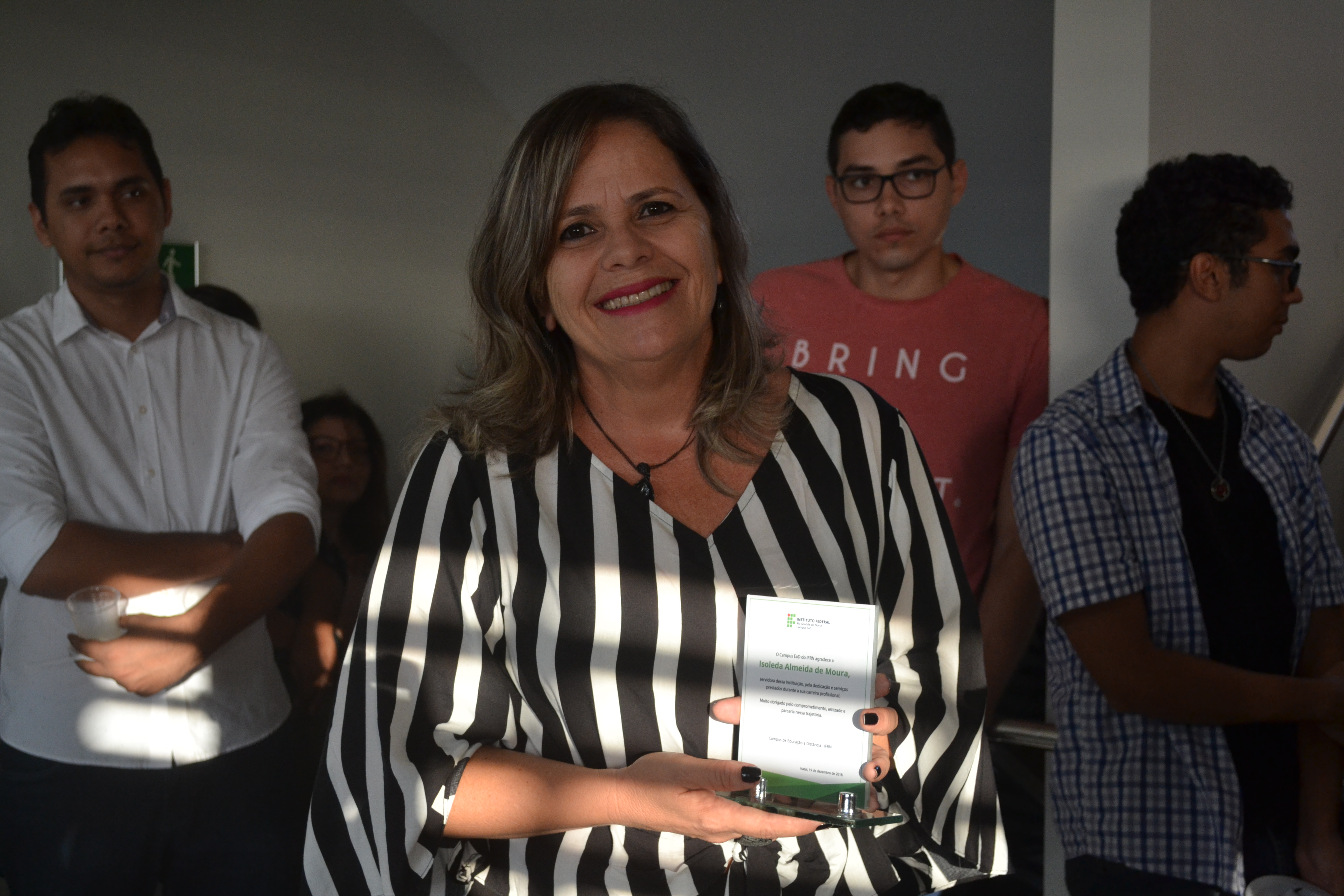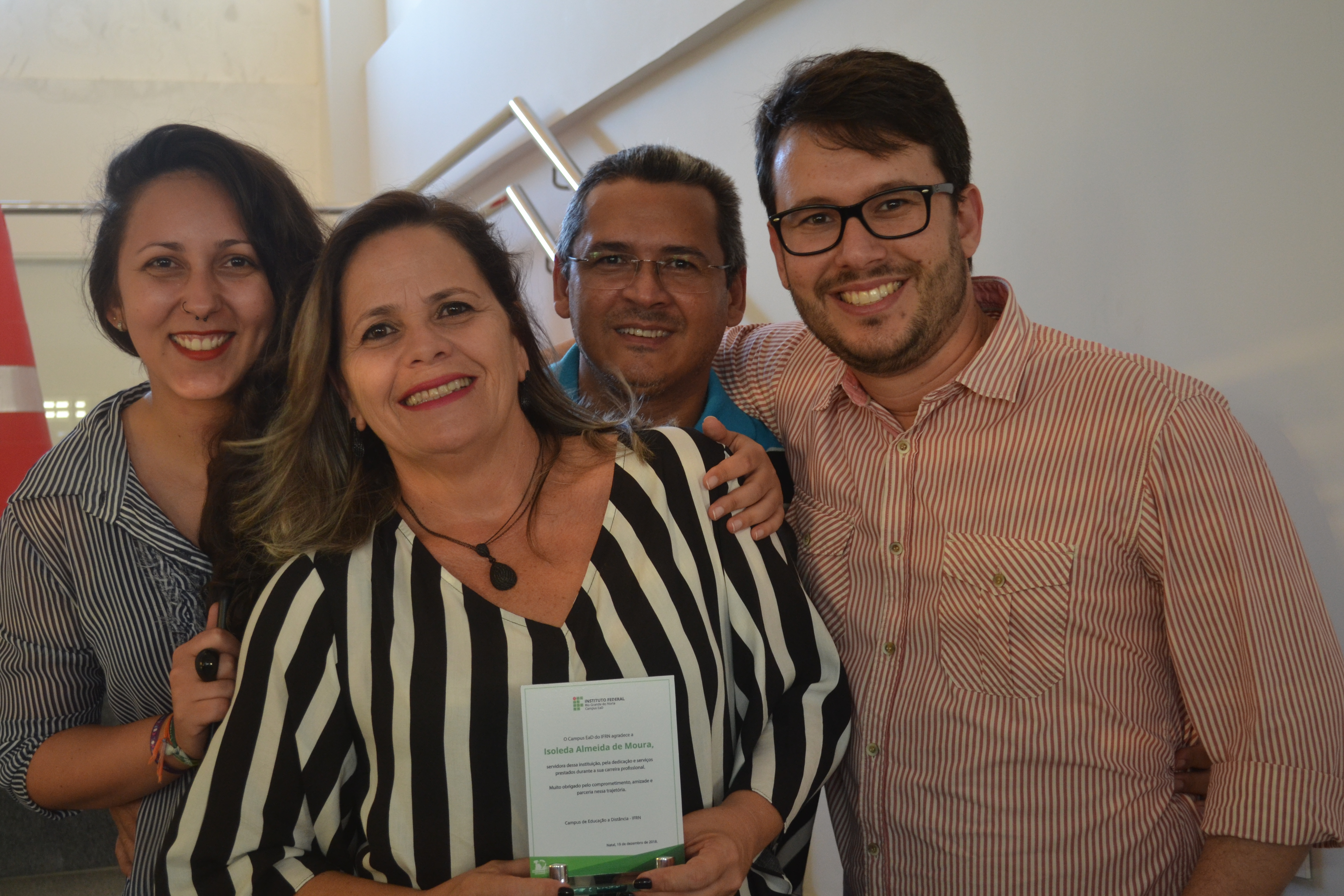Em celebração às festas de fim de ano, o Campus EaD homenageou, nesta última quarta-feira (19), cinco servidores que contribuíram para a evolução e desenvolvimento da instituição. A partir de palavras de carinho e admiração de ex-colegas de trabalho, os homenageados aposentados receberam um troféu de agradecimento pelos anos de dedicação e trabalho no IFRN. “Esta homenagem simboliza anos de dedicação à educação pública e de qualidade. Eu relutei muito para me aposentar, mas é bom saber que nunca me afastarei do Campus EaD, porque aqui tenho amigos que vou levar pra vida toda”, disse a professora Elizabete Alves, uma das homenageadas.